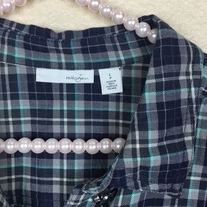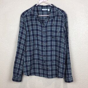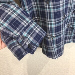 Jeweled clusters dotting the front. Woven-plaid shirt. Soft cotton blend. Long sleeve with button cuffs.