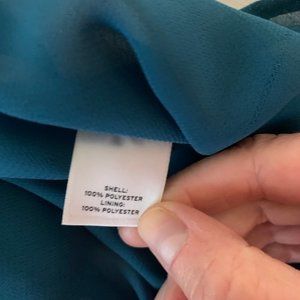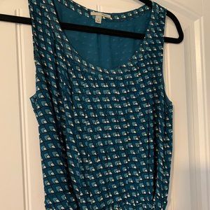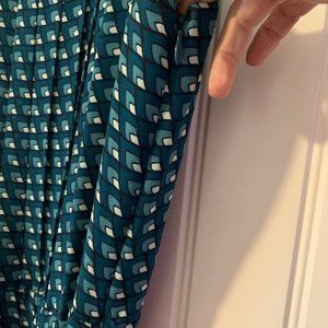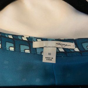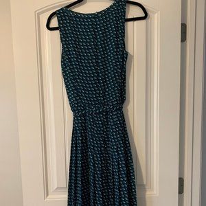 Gently worn Halogen dress in teal print. This dress is sleeveless with a scoop neck. There is a hidden zipper on the side of the torso and a tie belt of the same fabric. The skirt portion is fully pleated. The entire dress is fully lined and there are hidden snaps to secure your bra straps.