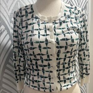 Halogen Green and White Geometric Crew Neck Cardigan Sweater
