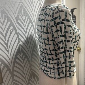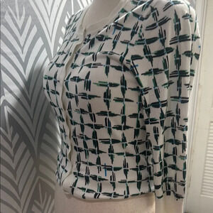 This Halogen cardigan sweater features a striking geometric pattern in green on a white base, offering a modern and stylish look. The three-quarter length sleeves and fitted silhouette make it perfect for layering over your favorite tops. Crafted with a blend of materials, it provides a comfortable fit with a touch of elegance.