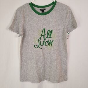 Heather grey t-shirt with green neckline. All Luck written on front of shirt surrounded by shamrocks. Perfect St. Patty's Day Shirt.