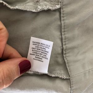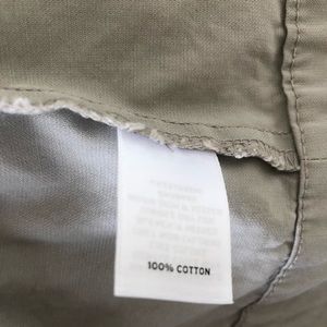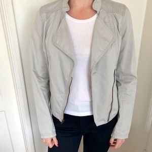 100% cotton. Front diagonal zip adds style. The light grey color matches everything! Excellent condition.