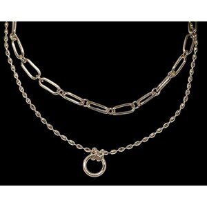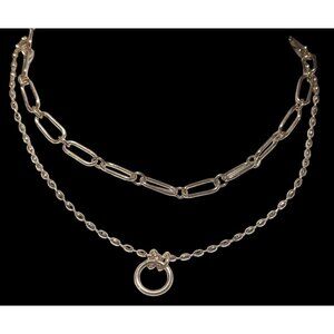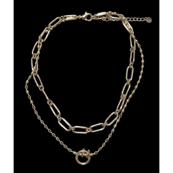 Stylish layered gold tone necklace featuring a unique circle pendant. Ideal for adding a touch of elegance to any outfit.