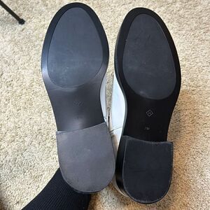 EUC with minimal signs of wear. Very faint marks on inner arch and back as shown in pics. Crisp white color and metal accents around sole. Leather upper