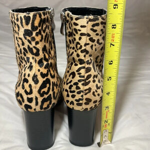 Ankle style booties are done in leopard print calf hair and have black stretch gore at each side of ankle and a side zip on the other side of the boot for easy entry. The boots have an approx. 3 inch block heel and the shaft measures approx. 5.5 inches. The boots have a round toe shape. A cute and classic yet on-trend pair of boots for less than regular retail.