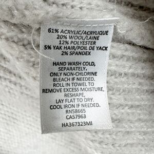 -61% acrylic, 20% wool, 12% polyester, 5% yak hair, 2% spandex