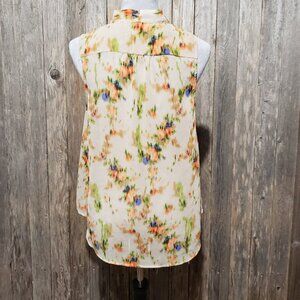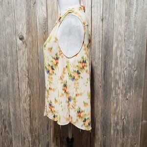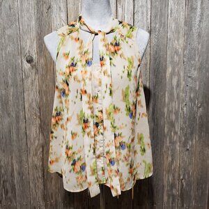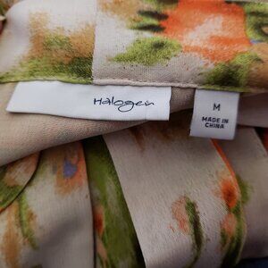 Halogen M Top Blouse Tan Beige Floral Sleeveless Tie Neck Button Front Women's