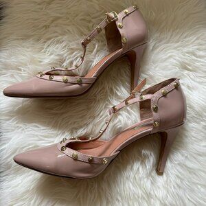 Halogen, size 8 T-Strap Studded Heel, Nude/blush with gold metal accents. Small damage shown on back of right shoe.