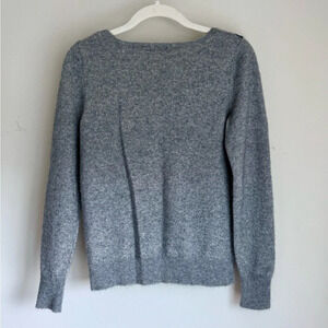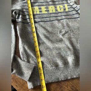 Super soft and cozy Halogen sweater featuring “Merci” in yellow across the chest. Crafted from a blend of 70% wool and 30% cashmere, this sweater offers both warmth and a playful touch with its graphic design and gray stripe detailing. In great condition and perfect for layering or wearing on its own.