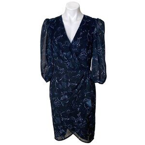 Halogen Navy Floral Wrap Dress, Sheer Puff Sleeves & Tulip Hem Women's Size M