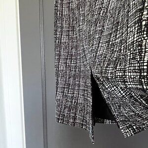 Beautiful Halogen straight midi pencil skirt in women's size 2 with a black and white graphic pattern and black waistband. This Nordstrom-brand skirt features is fully lined with a zippered back with a slit. This would look lovely for the office or special occasions.