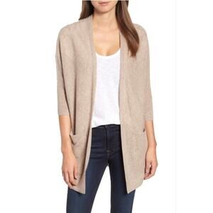 Oatmeal beige cashmere and wool blend long cardigan by Halogen, from Nordstrom. Open front drape style with two front patch pockets. Excellent pre-owned condition.