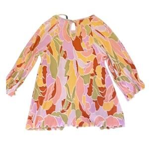 Playful Halogen pleated blouse in sunset pink, orange, and olive abstract floral print. Lightweight with flared cuffs and cinched waist for a flattering fit. Great for brunch, office layering, or spring holidays. Works well with denim, wide-leg trousers, or midi skirts.