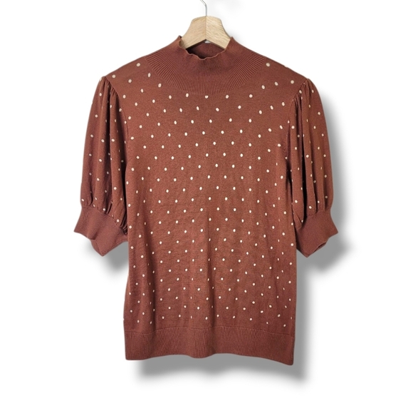 New with tags Halogen polka-dot sweater from Nordstrom in size Medium. This chic and feminine sweater features a warm rust background with ivory polka dots, short puff sleeves with ribbed cuffs, and a mock neck for a polished silhouette.