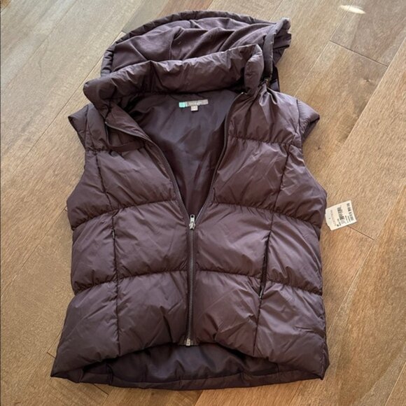 Cozy puffer vest. Ideal for layering. Features zip closure. Hoodie is removable. Outer zip pockets.