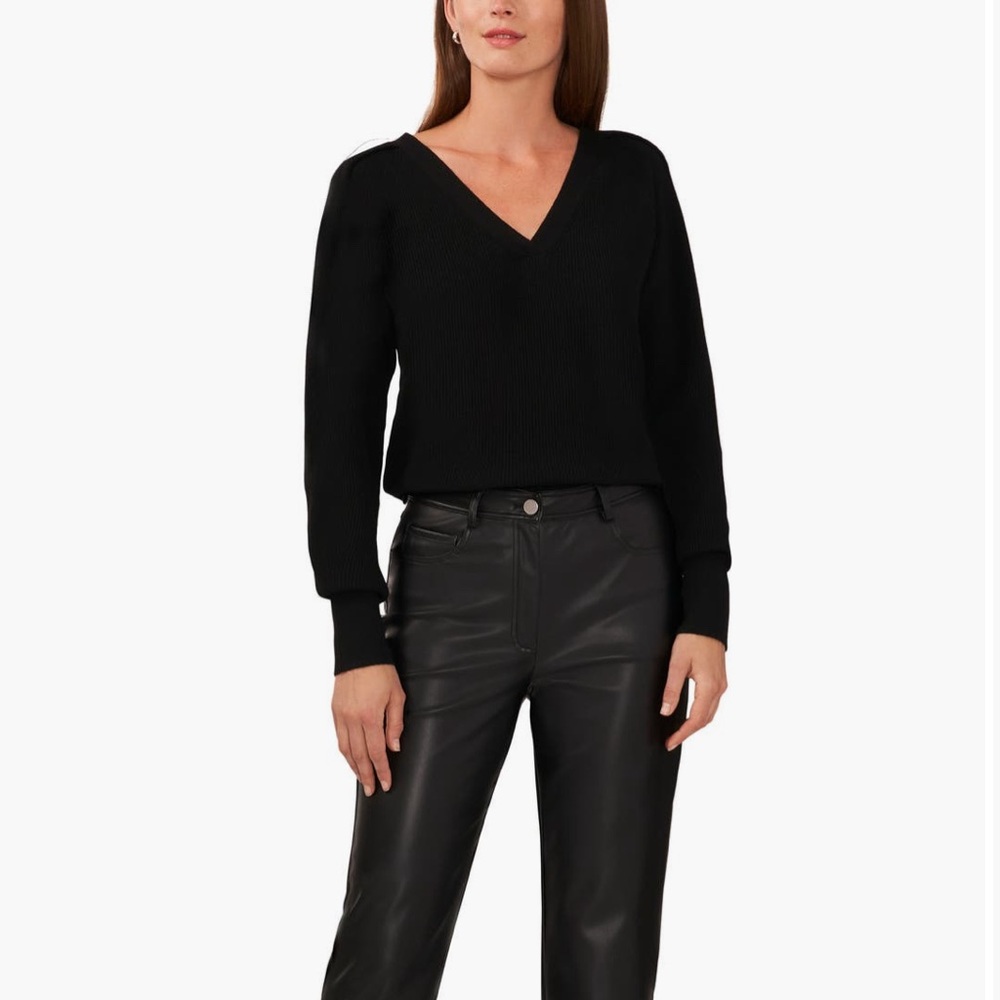 Elegant black V-neck sweater. Long sleeves. Perfect for any occasion.