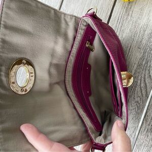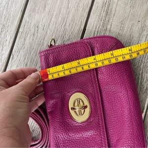 Chic and stylish raspberry pink leather crossbody bag with a gold-tone clasp. Perfect for adding a pop of color to any outfit.