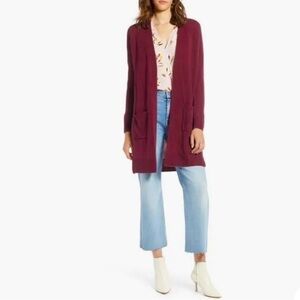 Halogen Rib Knit Wool & Cashmere Long Cardigan in Red Tannin Size S