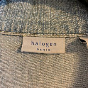 Halogen cotton denim logo button front, button cuffs, banded hem, spread collar size L washed faded denim jacket. Size L. Four front pockets (two side and two chest flap) adjustable button banded hem. Good condition. 20" length.