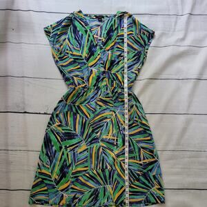 Halogen Size XS Tropical Jungle Cap Sleeve V-Neck Faux Wrap Blue Green Dress