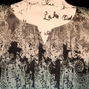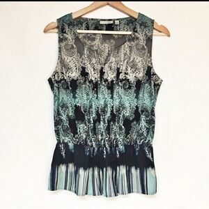 Ombré shades of blue with gray. Sleeveless blouse with pleat design along bustline and a cinched/banded hem. T-75