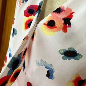 This Halogen blouse is a stylish and feminine piece for your wardrobe. The blouse features a semi-sheer white fabric with a vivid abstract floral pattern throughout, adding a pop of color and a touch of whimsy to your outfit.