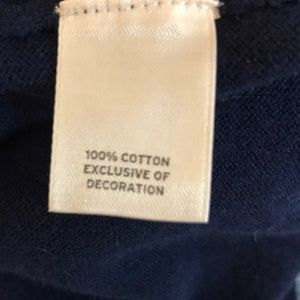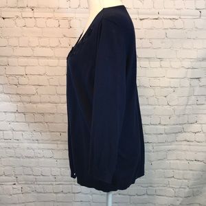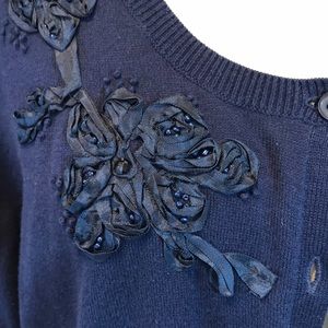 Navy button Halogen Sweater with embroidered flowers around the collar. Three quarter sleeves, soft and light weight