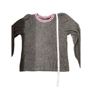 Halogen Blouson Sleeve Knit Sweater Grey Heather Stripe Neck Crew Neck Pullover. Button detail in back. Fitted wrist cuffs. Soft and comfy.