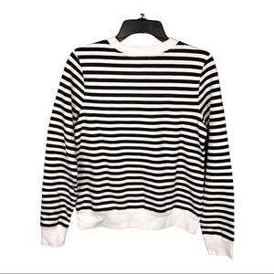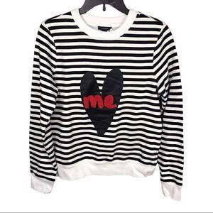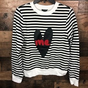 Crew Neck Sweatshirt by Halogen. Black White Stripe with Black Heart ME Patch on Front. Size Small