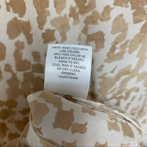 Tan on cream print. Fabric is silk/rayon blend. Pleated detail at v-neck armholes and at front of bodice. Fits straight through torso.