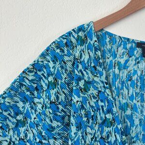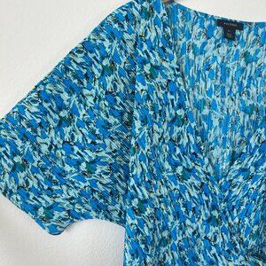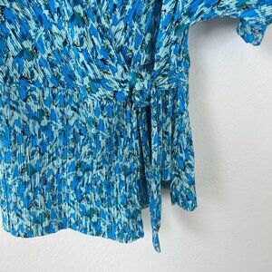 Halogen Top Womens Medium Aqua Blue Floral Print Ribbed Faux Wrap Blouse M