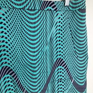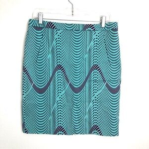 Halogen pencil skirt in excellent condition. Turquoise, lavender and gray abstract wave design, rear vent, fully lined, hidden rear zipper.