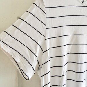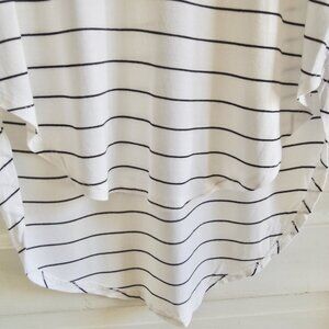 Halogen white & black striped high low top, size Small. Summery rayon knit top is white with narrow black stripes, round neck, short sleeves, and a rounded high-low hem. Soft, flowy, and stretchy with a casually elegant vibe. EUC.