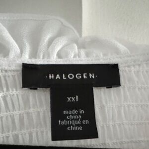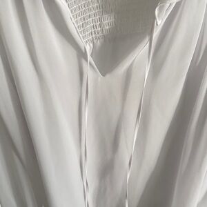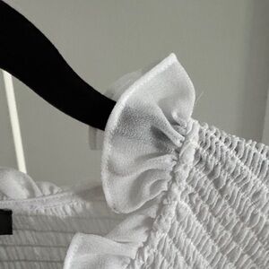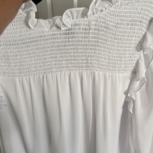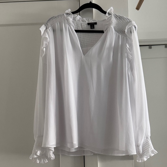 Chic white blouse with ruffle accents. Features smocked shoulders and cuffs. Ideal for versatile styling.