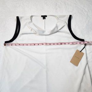 halogen, sleeveless blouse, cowl neck, white top, black trim, women's large, office wear, business casual, versatile, layering top, chic, contemporary, Summer, career, Spring, semi-sheer