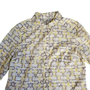 Halogen White Yellow Gray Geometric Print long sleeve button front top sz SP