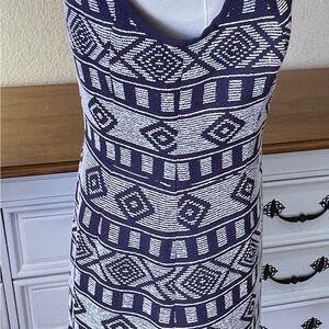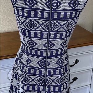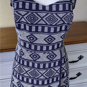 This Halogen dress showcases a stylish sheath silhouette in a sophisticated white and navy color scheme. The sleeveless design features a flattering sweetheart neckline, perfect for both casual and work settings.