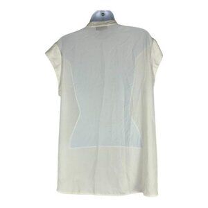 This blouse offers an elegant draped design with cap sleeves, crafted in lightweight ivory polyester, suitable for professional or casual ensembles.