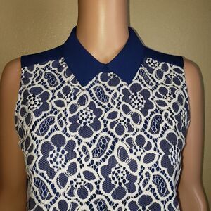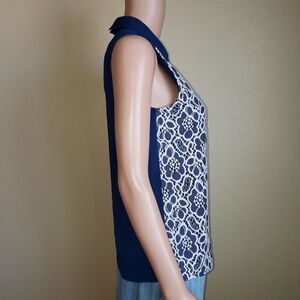 EUC women's sleeveless collared lace front blouse, blouse is navy blue and lace front over it. Hidden zipper in back.