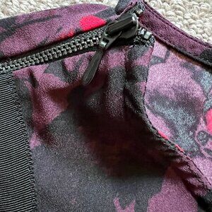 This lovely Halogen blouse features a beautiful purple floral pattern with ribbon trim and a scoop neck. The sleeveless design with wide straps and pullover closure makes it a great choice for casual or business occasions. Made of polyester, it has a classic fit and is size medium. The zipper accents add a touch of uniqueness to this classic style blouse. It is a great addition to any wardrobe and perfect for those who love floral themes.