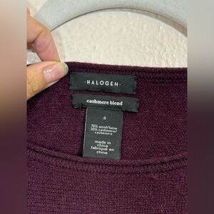 Halogen Wool & Cashmere Blend Pullover Dark Purple Sweater Women’s Size Small. Dry clean. Made in China. Has several marks (i have not tried to remove stains), has lint throughout.