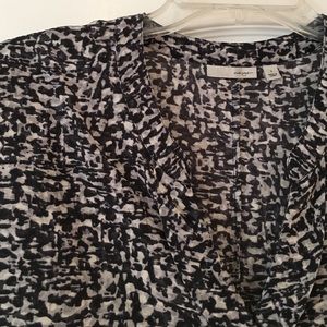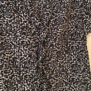 Halogen - Nordstrom short sleeve blouse. Black/Gray marled pattern. V-neck with ruffle detailing down the front. Back seam is slightly worn as is shown in last picture. Not noticeable unless up close to garment. 100% silk. Dry clean or hand wash only.