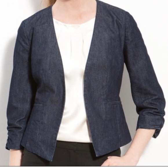Halogen denim 3/4 ruched sleeves open women’s blazer sz 6