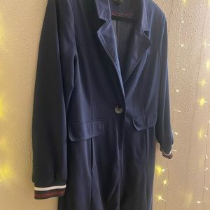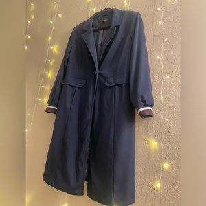 Halogen long trench coat in navy with burgundy and white cuff detail and pockets