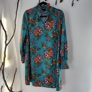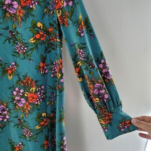 mini style retro inspired dress. floral print with turquoise background. ruffle neck. long sleeve. Preloved condition. All sections of interest as well any known flaws have been documented in the photos and noted as thoroughly as possible. if there are no known flaws, none will be noted. Please feel free to ask any questions before purchase 🙂.