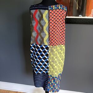 Halogen silky blocked geometric print sleeveless shift midi. Exposed back zipper. 100% polyester. Medium. Excellent condition. Nonsmoking home.
