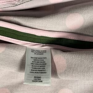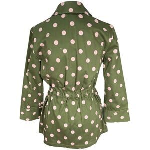 Stylish and rare Halogen x Atlantic-Pacific jacket in olive green with playful pink polka dots. Designed with a flattering drawstring waist, front zipper plus button closure, and classic collar. Crafted from a soft cotton blend with a hint of stretch for comfort and structure. Perfect for layering year-round and adding a chic pop of pattern to any outfit.
