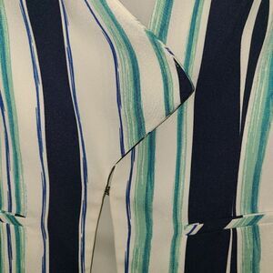 Halogen A- Symmetrical Striped Blazer in a size medium.  Has a hook on the front for closure and is nicely tailored.  Pretty teal, navy and white stripes.