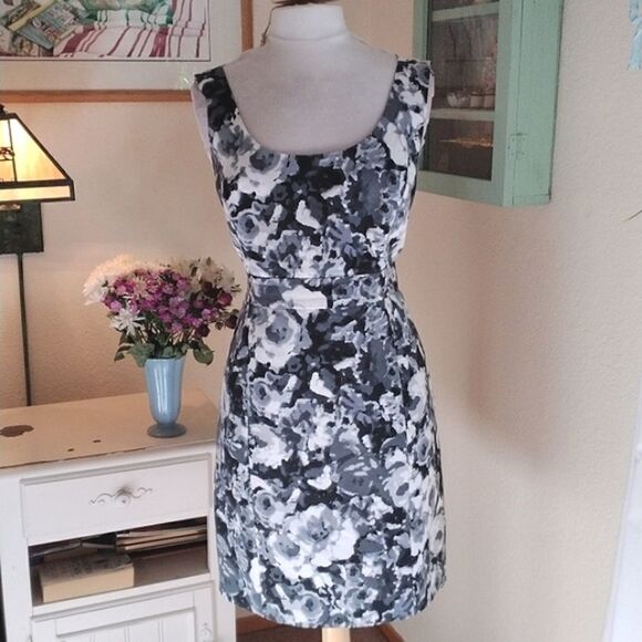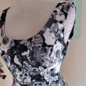 Beautiful scoop neck and princess seaming make this a flattering dress. Sheath shape, Back zip. Fully lined. Size 14 measures 42 at chest, 35 at waist, 44 at hips, 36 long from shoulder to hem. Elegant gray tones.