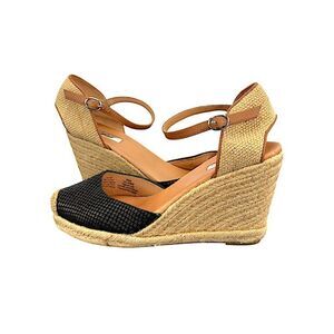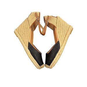 -- Featuring a chic black textured closed toe, tan ankle strap with buckle closure, and woven natural jute wedge platform.